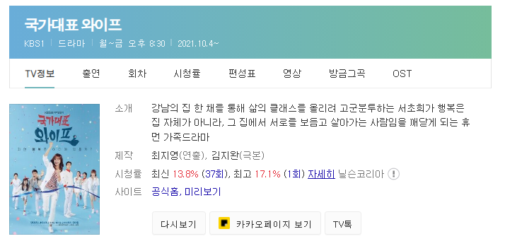 국가대표 와이프 방송은 2021년 10월 4일부터 KBS 1TV에서 방송하는 일일저녁 드라마입니다. 평일 안방극장에서 저녁 8:30~9:00까지 시청하실 수 있고 방송을 시간관계상 시청할 수 없는 경우 모바일과 인터넷을 통해서 간단하게 접속 후 고화질로 시청 하시길 추천드립니다. 인터넷 접속 창에서 티비무료다시보기 사이트 접속하셔서 무료로 제공하고 있는 곳을 통해서 이용해보시길 바랍니다.