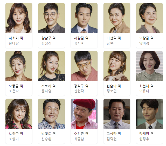 한다감 : 서초희 역 - 12년차 광고회사 AE이자 강남 진입을 목표로 살아가는 억척 와이프, 서강림의 누나, 서보리의 언니, 강남구의 아내, 강리안의 엄마, 오장금의 맏딸, 나선덕의 며느리, 강석구의 형수, 송파란의 사촌올케