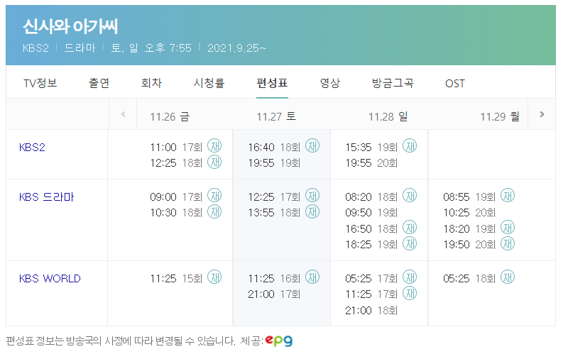 드라마 신사와 아가씨 본방송을 놓치신 분들은 방송편성표를 참고하시어 재방송 다시보기 하실 수 있으며 인터넷이나 인터넷이나 모바일 네이버 카카오TV를 통해서 미리보기 방송을 즐감하실 수 있습니다.