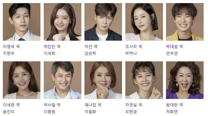 이종원 : 박수철/장경훈(56세) 역 - 차연실의 남편, 애나 킴(김지영)의 전남편, 박대범의 의붓아버지, 박단단의 친아버지, 차건의 매형, 장미숙의 잃어버린 남동생, 봉준오의 외삼촌