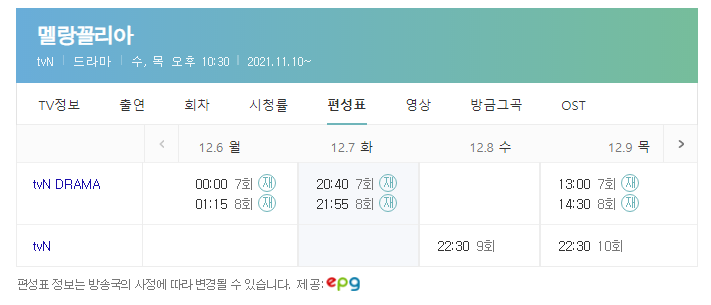 드라마 멜랑꼴리아 본방을 시간관계상 못 보신분들은 TV방송편성 정보를 통해서 모바일 및 스마트폰을 이용해서 무료 다시보기 즐감하시기 바랍니다