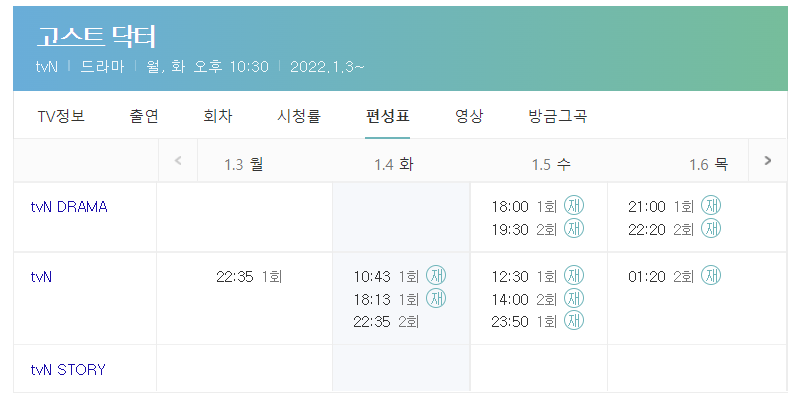 tvN 드라마 고스트 닥터 드라마를 개인사정성 시청하지 못한 경우 위 TV방송편성표의 재방송 시간 정보를 활용하시어 모바일 인터넷 링크를 통해서 시청하시기 바라며 카카오나 네이버 3분 미리보기를 통해서 대략적인 줄거리 내용도 확인하실 수 있으니 이점 참고하시어 즐감하시기 바랍니다