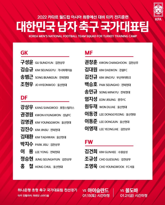 한국과 아이슬란드 경기는 월드컵 최종에선 레바논 원정대비로 국내파 선수들 위주로 기회를 부여하는데요 대한민국 축구 국가대표팀 파울루 벤투 감독은 2022년 새해 첫 경기를 유럽의 복병 아이슬란드와 친선 경기로 카타를 월드컵을 대비해서 K리그 선수들이 주축이 돼서 경기가 펼칠 예정입니다.
