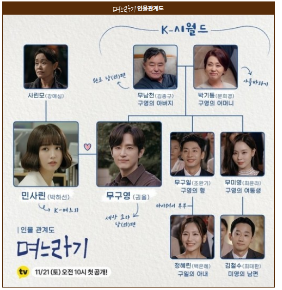최윤라 : 무미영 역 - 구영의 여동생. 구영네 부부보다 약간 빨리 결혼했다. 미영은 엄마에게 배운대로 내조 잘하면 화목하게 잘 살 수 있을 줄 알았는데, 현실은 그보다 훨씬 복잡하다. 남편이 자꾸 친정 가서 돈 빌려 오라고 해서 화가 난다. 사린의 시누이로 얄미울 때도 있지만, 때로는 같은 며느리 입장에서 동변상련도 느낀다