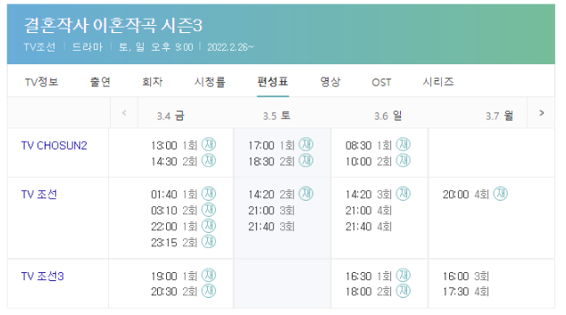 TVCHOSUN에서 방영되는 주말드라마 결혼작사 이혼작곡3 시즌2와도 출연 배우진이 많이 변경되었는데요 자세한 시청방법은 아래를 참고하시고 인터넷 모바일 등 검색창에서 간단히 무료티비 다시보기로 검색시 무료보기 시청도 가능합니다.
