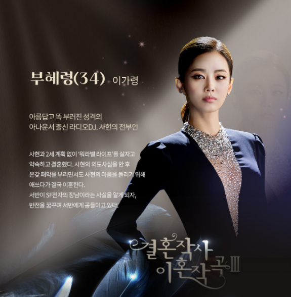 이가령 : 부혜령 (34세) 역 - 아름답고 똑 부러진 성격의 아나운서 출신 라디오 DJ, 사현의 전처.