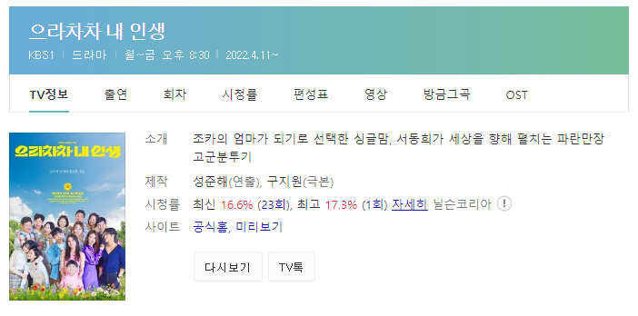 KBS1 4월 11일 첫방송을 시작하는 일일드라마 으라차차 내 인생 본방송을 놓치신 경우 인터넷 및 모바일 방송을 이용해서 간단하게 접속 후 고화질로 시청을 하시길 추천 드립니다. 인터넷 검색창에서 티비무료다시보기 사이트 접속후 제공하고 있는 미디어 방송정보를 통해서 이용해보시기를 바랍니다.