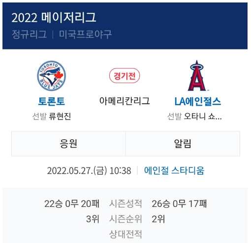 이번 토론토 블루제이스와 LA에인절스의 대결은 그 어느때보다 관심을 가지는 LA다저스 시절 류현진 선수는 LA에인절스전 상대로 강한 면모를 보여 완봉승을 비롯한 좋은 성적의 기억을 가지고 있는데요