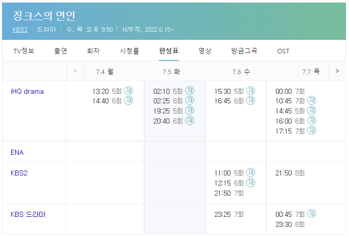 KBS2 에서 매주 수목 저녁 9시 50분 징크스의 연인 본방 놓치신 경우에는 티비편성표 참고하시어 OTT채널 서비스와 모바일 인터넷을 이용하여 무료다시보기로 즐감 바랍니다. 네이버나 카카오 티비를 통해서 영상클립 무료보기 시청도 가능합니다