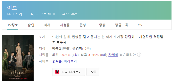 tvN드라마 이브(eve)는 2022년 6월 1일부터 방송중인 수목드라마다. 시간관계상 방송을 시청하실 수 없는 분들은 인터넷 및 모바일 방송을 이용해서 간단하게 접속 후 고화질로 시청을 하시길 추천 드립니다. 인터넷 접속 창에서 티비무료다시보기 사이트 접속하셔서 무료로 제공하고 있는 곳을 통해서 이용해보시길 바랍니다.