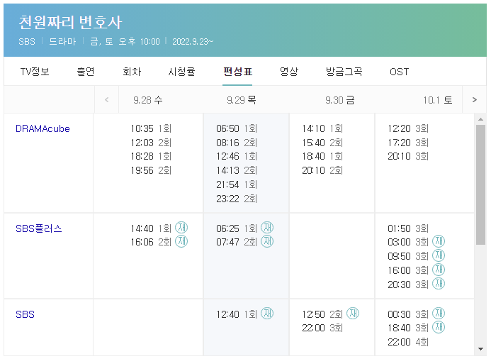 매주 SBS금토드라마 천원짜리 변호사 저녁10시에 본방송 진행하며 본방을 놓치신 분들은 TV방송편성표를 통해서 OTT 다시보시기 하실 수 있으며 인터넷이나 모바일 스마트폰을 이용해서 즐감하실 수 있습니다