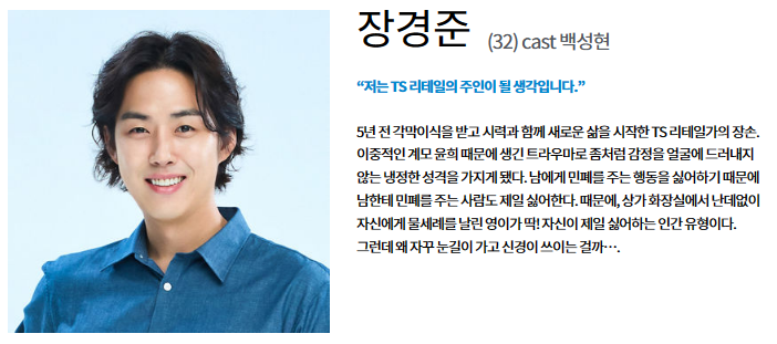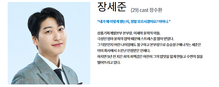 정수환 : 장세준역, 청춘 라인업4 이미 회사에서 인정받은 잘나가는 인재 하지만 5년전 사고의 죄책감을 씻을 수 없는 경준의 의붓동생 역할