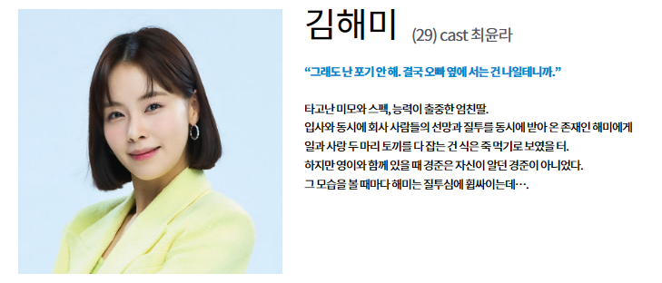 최윤라 : 김해미역, 죽은 도진의 사촌동생으로 타고난 미모 그리고 엄친딸로 능력이 출중하여 늘 그렇듯 영이와 경준의 관계에 질투심에 사로잡히는데
