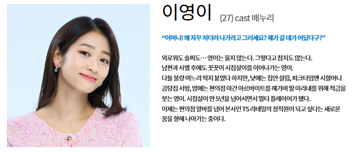 배누리 : 이영이역, 편의점에서 3년동안 일한 여직원 슬퍼도 외로워도 남편과 사별했음에도 꿋꿋하게 시집살이를 해나가는 영이 새로운 꿈을 향해 그리고 경준과의 로맨스 매회차 흥미 진진한 스토리로 감동과 아픔을 전하는 캐릭터