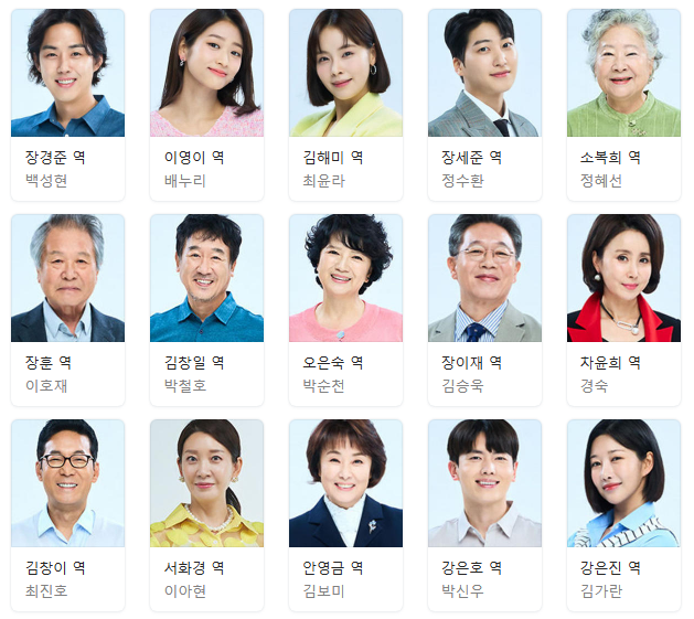빼놓을 수 없는 소복희 가의 큰 어른 정혜선을 비롯 곰탕집 이영이 시할머니 역 김창일 역으로 출연한 이영이 그리고 맏며느리 역할의 오은숙역 둘째 아들 역할의 최진호 역시 은행지점장에서 물러놔 이시대의 중년 남성들에게 공감을 주는 역 그리고 딸을 위해서 그 어떤 빌런의 역할을 마다하지 않는 이아현 청춘 라인과 관록의 라인들이 조화롭게 이루는 내눈에 콩깍지 배우들의 활약 또한 기대해 보시기 바랍니다