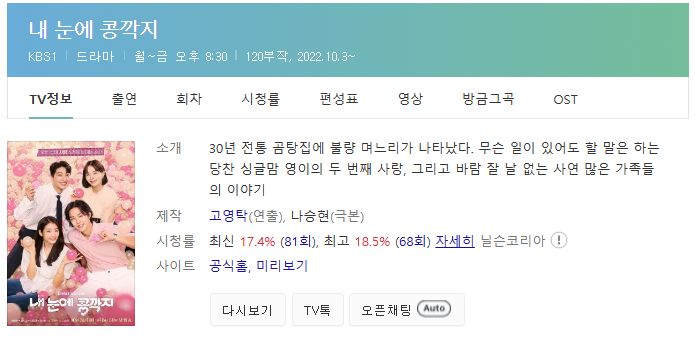 2022년 10월 3일부터 KBS 1TV에서 방영하는 고영탁 연출의 나승현 극본으로 총 124부작으로 제작되는 내눈에 콩깍지 30년 전통의 곰탕집에 듣도보도 못한 며느리의 한바탕 소동 이야기 가족들의 코믹 휴먼몰 바람 잘 날 없는 이야기로 일일저녁 시청자들의 안방에 찾아갑니다