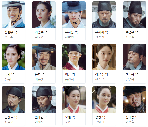 우도환 : 강한수역 송사를 일으키고 다니는 트러블메이커 변호사. 술과 여자를 그리고 몹시 좋아하면서 한양 최고의 백전불패의 엘리트 외지부. 법에 관해선 민법, 상법, 형법을 통달한 것도 모자라 명나라 법전까지, 서책 또한 논어맹자에 대학중용까지 줄줄 읊을 만큼 해박