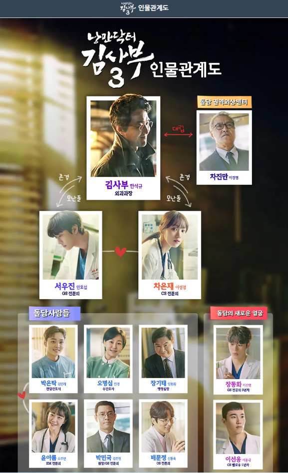 한석규 (김사부 역) - 돌담병원 외과 과장 겸 돌담의료재단 이사장. 한석규는 한때 "신의 손"이라 불리는 트리플 보드 외과의로, 낭만닥터라 불리며 돌담병원에서 외과과장으로 일하고 있습니다. 돌담병원에 권역외상센터를 설립하고자 노력하며 병원을 지켜왔지만, 권역외상센터 설립에 대한 어려움이 찾아오게 됩니다.