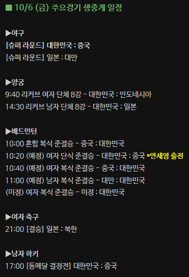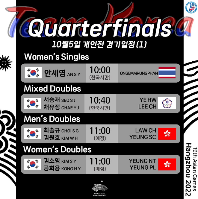 | 항저우 아시안게임 배드민턴 중계 경기 대진표 경기일정 안내 (0) | 2023.10.06 |