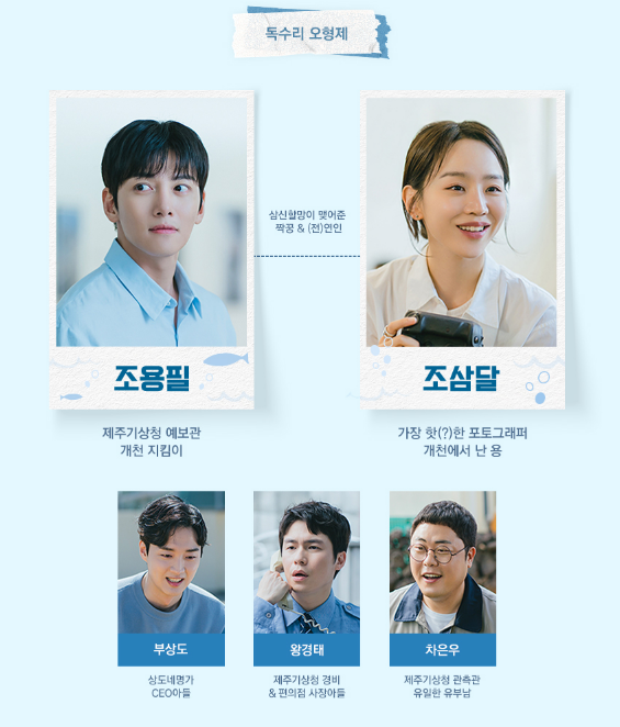 조용필역 - 지창욱 : 제주기상청에서 근무하고 있으며 꼴통예보관으로 제주명물 순정남 반골기질 다분하며 사사건건 본청 의견에 반대하며 겁없는 예보관