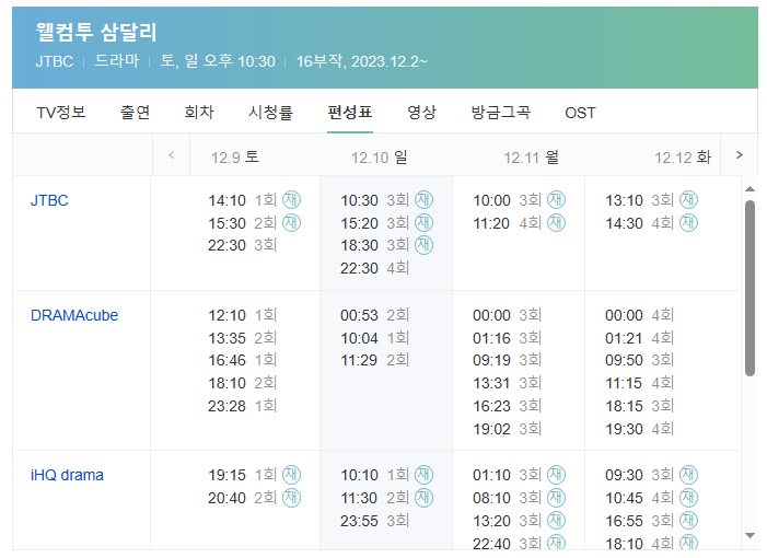 2023년 12월 2일 부터 2024년 1월 21일 까지 예정된 jtbc 드라마 삼달리 드라마 매주 토,일요일 저녁 10시 30분에 방영됩니다 다시보기 정보는 아래 OTT채널 티빙 통해서 다시보기 가능합니다.