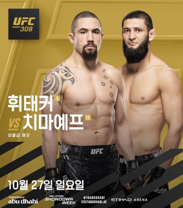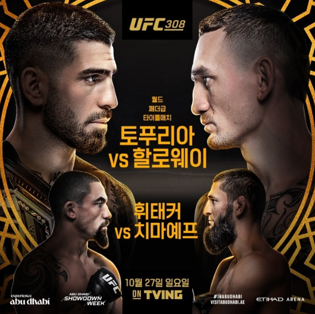 UFC 308은 2024년 10월 26일 토요일 아랍에미리트 아부다비 에티하드 아레나에서 열립니다. 중계 정보는 다음과 같습니다