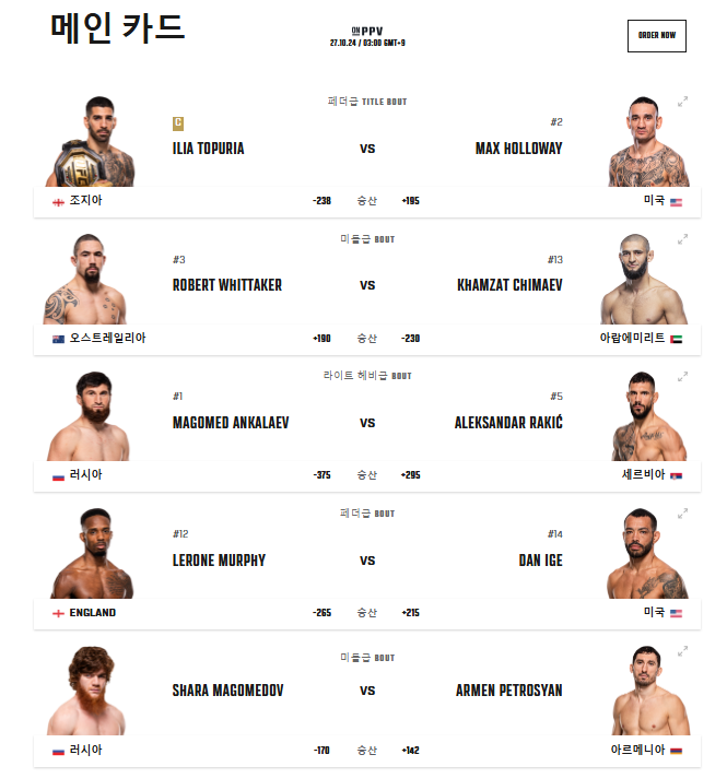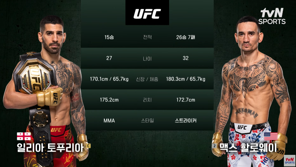 메인 이벤트는 페더급 타이틀전으로, 현 챔피언 일리아 토푸리아와 전 챔피언 맥스 할로웨이의 대결입니다. 토푸리아(15승 무패)는 올해 초 알렉산더 볼카노프스키를 꺾고 획득한 타이틀의 첫 방어전을 치르게 됩니다. 할로웨이(26승 7패)는 2019년에 잃은 타이틀을 되찾기 위해 도전합니다.