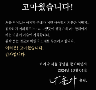 이번 서울 공연은 나훈아의 전국 투어 '고마웠습니다'(라스트 콘서트) 시리즈의 대미를 장식하는 마지막 무대가 될 예정입니다