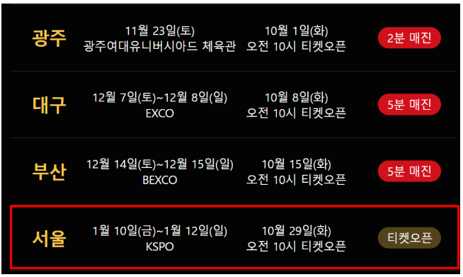 서울: 2025년 1월 10일~12일 (서울 올림픽공원 케이스포돔)