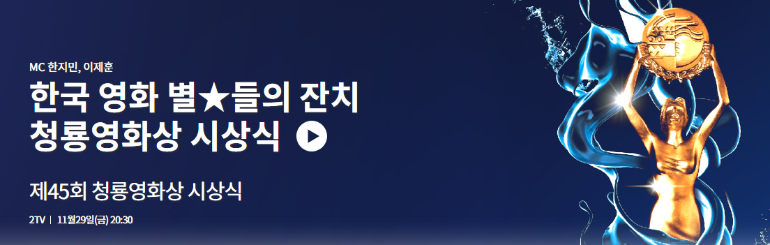 2024 한해 마무리를 하는 영화인의 축제 45회 청룡영화제 시청 시간이 다가왔습니다. TV시청이 어려울 경우 아래 채널 통해서 모바일과 웹으로 편리하게 시청하시기 바랍니다.