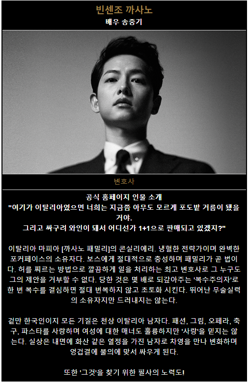 첫 방송부터 파란을 일으키면서 스케일 높고 완성도 높은 드라마로 시청자들의 많은 관심을 끌고 있는 빈센초 반전 매력과 그리고 흥미로운 스토리로 충분히 재미를 느낄 수 있는 주말드라마로 손색이 없을 만큼 송중기의 매력과 완성도 높은 드라마를 느낄 수가 있을것 같습니다