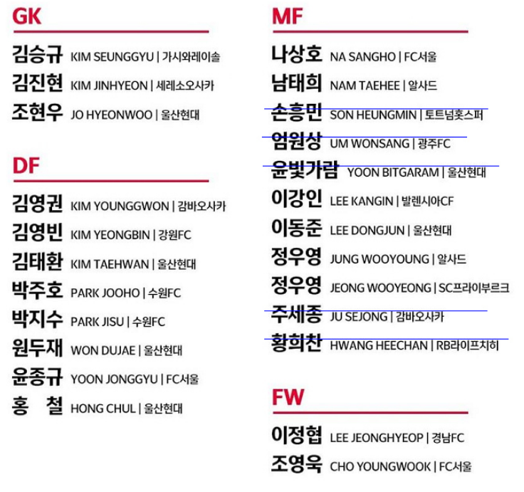 이번 발표 선수 명단에는 처음 발표한 명단과 다소 많이 달라진 부분이 있습니다. 가장 큰 사항으로는 손흥민 선수의 햄스트링 부상으로 제외되는 아픔을 겪네요 하지만 조속한 시일내 건강한 몸으로 볼 수 있기를 응원합니다.