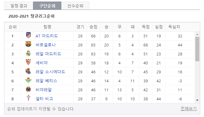 현재 라리가 2020-21 정규리그 구단순위는 아래와 같습니다 바르셀로나가 20승 5무 4패로 승점 65점 그뒤를 바짝 레알 마드리드가 19승 6무 4패로 치열한 접전을 이루고 있는 만큼 그 어느 때보다 치열한 승부를 예고하고 있습니다.