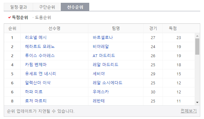 선수순위는 1위로 리오넬 메시가 23점으로 선두를 유지하고 있네요 메시의 선전과 4위에 랭크 되어 있는 카림 벤제마 이 둘의 대결 중계도 확인하시기 바랍니다.