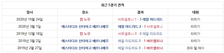 이들의 5경기 전적도 살펴 보실까요 바르셀로나 레알마드리드 2승 1무 2패 각 동률을 이루고 있는데요 가장 최근 경기는 2019년에는 바르셀로나가 우위에 있었고 최근에는 레알마드리드가 우위에 있어서 이번 경기에서 과연 어떤 승부로 역사에 기록 될까요. 이번 2020-21 라리가 중요한 일전을 앞두고 있는 바르셀로나 레알마드리드 경기는 스포티비 나우에서 모바일 스마트폰을 이용해서 실시간 생방송 중계를 시청하실 수 있습니다.
