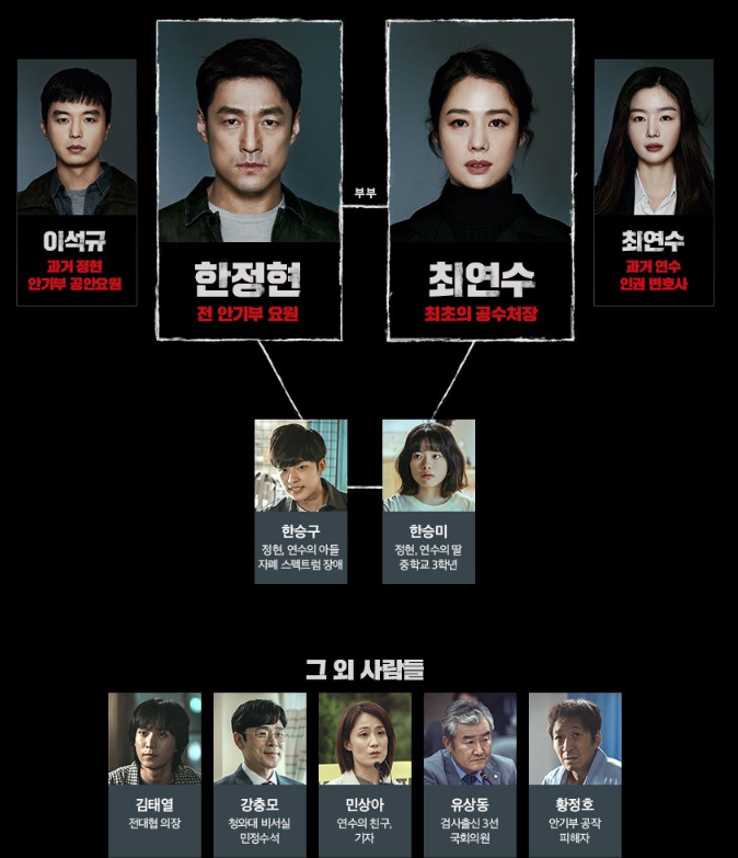 국정원 기획조정실 알파 팀 팀장, 임형락의 오른팔로 함께한 세월이 20년을 훌쩍 넘는다. 충성스런 행동대장으로 임형락을 추종한다. 임형락의 명은 묻지도 따지지도 않고 맹목적으로 복종한다. 안기부 시절부터 정현과는 앙숙이었으며 질투와 시기가 성공의 힘이었다. 언젠가는 형락처럼 먹고, 마시고, 입고, 사는 모든 걸 똑같이 따라 하고 싶다. 때문에 형락의 인정을 받기 위해 수단과 방법을 가리지 않는다. 연수의 공수처장을 취임을 저지하라는 형락의 엄명과 정현에 대한 사적 감정이 뒤섞여 무슨 짓을 저질러도 이상하지 않은 요주의 인물.