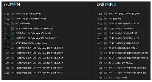 스포티비 채널은 주요 전문채널 SPOTV NOW, SPOTV ON 채널 스포티비 나우는 UFC 중계를 비롯 우리나라 손흥민 선수가 뛰고 있는 EPL 리그 또한 하이라이트 주요 경기 결과 영상을 무료로 시청하실 수 있습니다